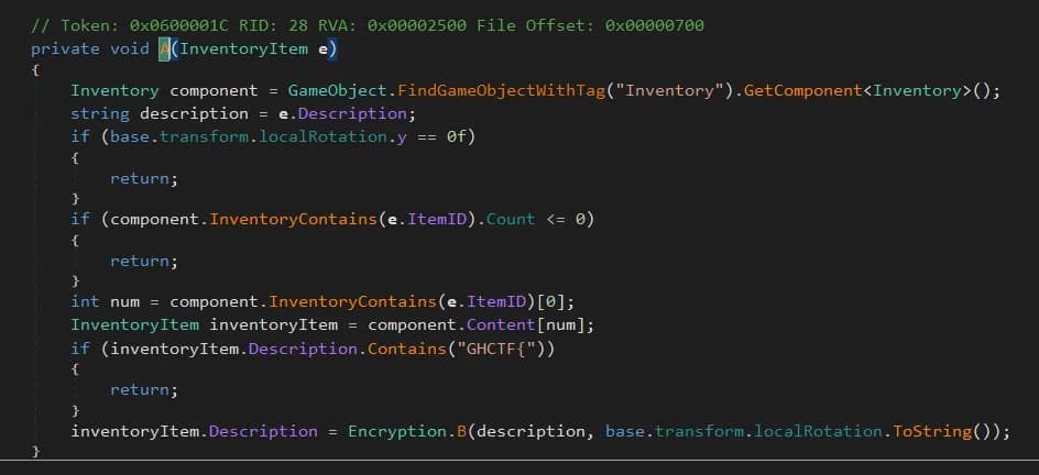 Method A() just do some sanity check, like the tag “Inventory”, base.transform.localRotation, etc. Not much that we will look into. It also check if the description contains GHCTF{ or not, which is the flag format of the CTF. Then, it will invoke the Encryption.B() method, with two params is: