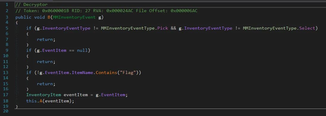 This method does nothing much, it only checks if the item name contains Flag or not (but you may ask, which item?). If it is, it will go to method A(), bringing with the g.EventItem as a param.