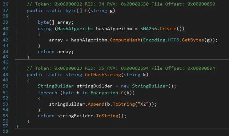 The SHA256 hexdigest of the .ToString() string. Next, it will be decrypted by XOR One-time Pad (OTP). If the length of base64 encoded description is longer than the hexdigest, it will go cyclic.