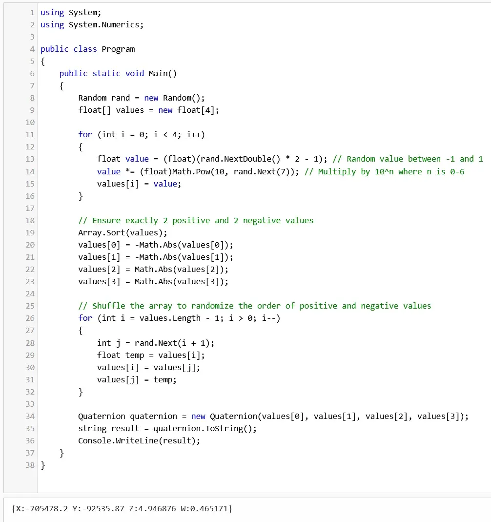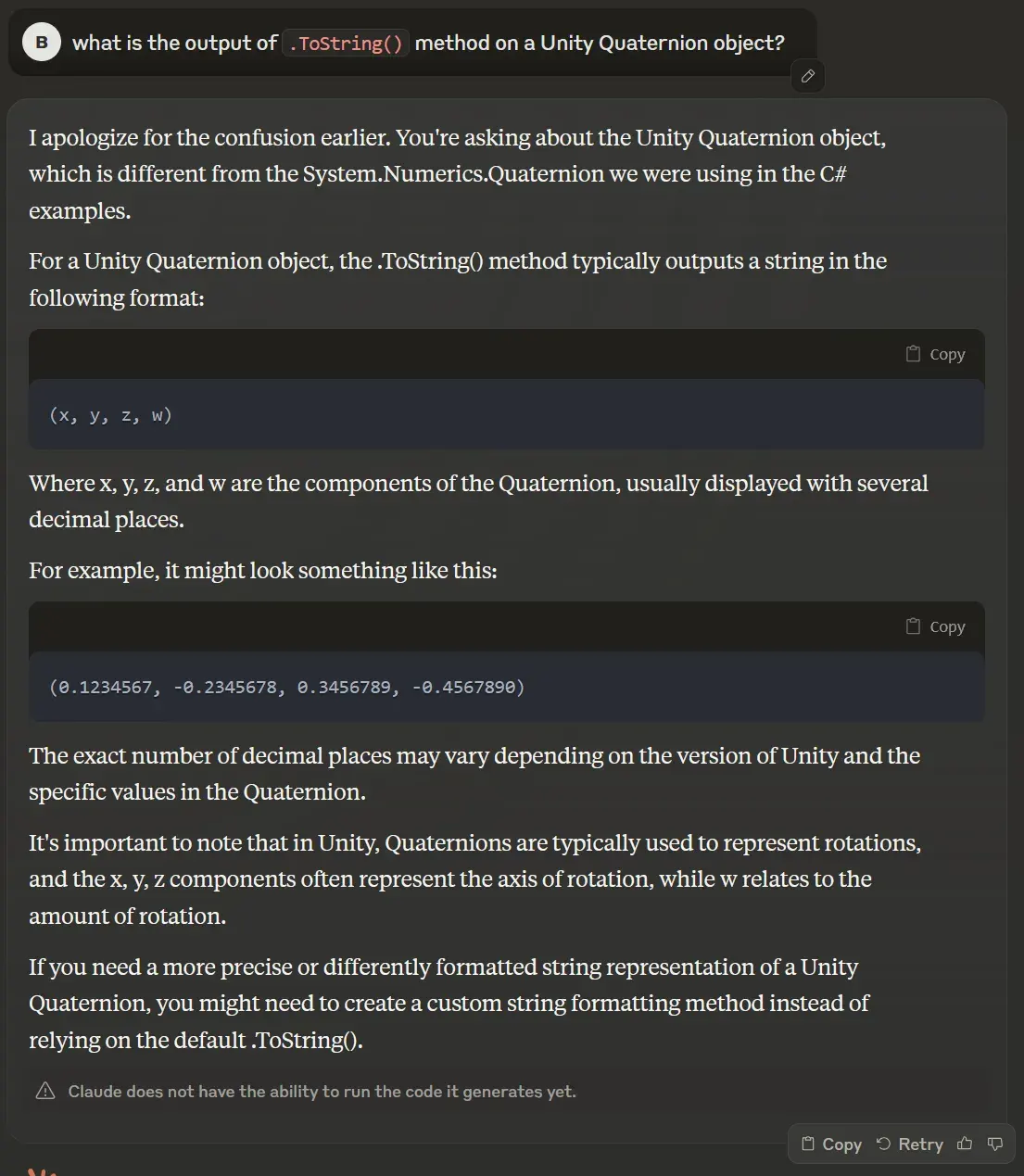 Great! We have found the rotation. But remember, the rotation is parsed via .ToString()… And I am too lazy to install a whole bunch of Unity just to run a line of code. So, I have check the docs from Unity, reverse the type of .localTransform(), and know that .localTransform() is actually a Quaternion object. This doc helped me to know what is the original C# type. Then, I just went to DotNetFiddle to write a prototype. Code is sponsored by Claude :)